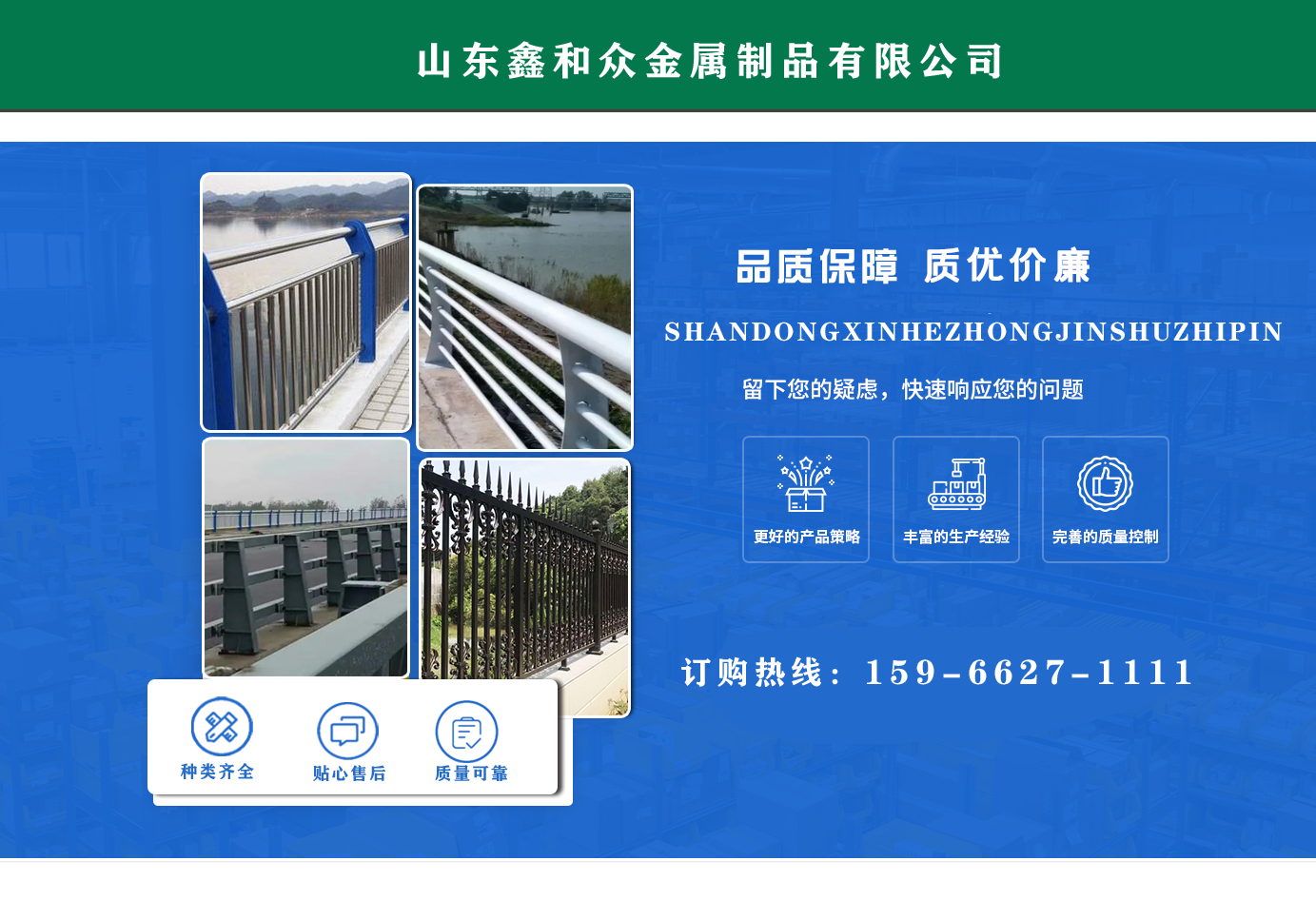 山東鑫和眾金屬制品有限公司主要產(chǎn)品有防撞護欄,橋梁護欄,道路護欄,河道護欄,不銹鋼護欄等護欄。提供設(shè)計方案,一站式定制,包您滿意價格優(yōu)惠,歡迎來電咨詢! 公司常年從事銷售護欄防撞護欄,橋梁護欄,道路護欄,河道護欄,不銹鋼護欄,橋梁鋼護欄,河道燈光護欄等。產(chǎn)品廣泛應(yīng)用于橋梁、河道、旅游景區(qū)、道路、公路、公園、小區(qū)、景觀、道路防撞等領(lǐng)域。 公司產(chǎn)品均采用優(yōu)質(zhì)不銹鋼材料,符合相關(guān)標(biāo)準(zhǔn)。各種型號不銹鋼復(fù)合管及護欄,質(zhì)量嚴(yán)格把控。產(chǎn)品強度高、耐腐蝕、焊接牢固、抗沖擊、性能好,防撞護欄結(jié)構(gòu)簡單、美觀實用大方。 歡迎前來訂購!...